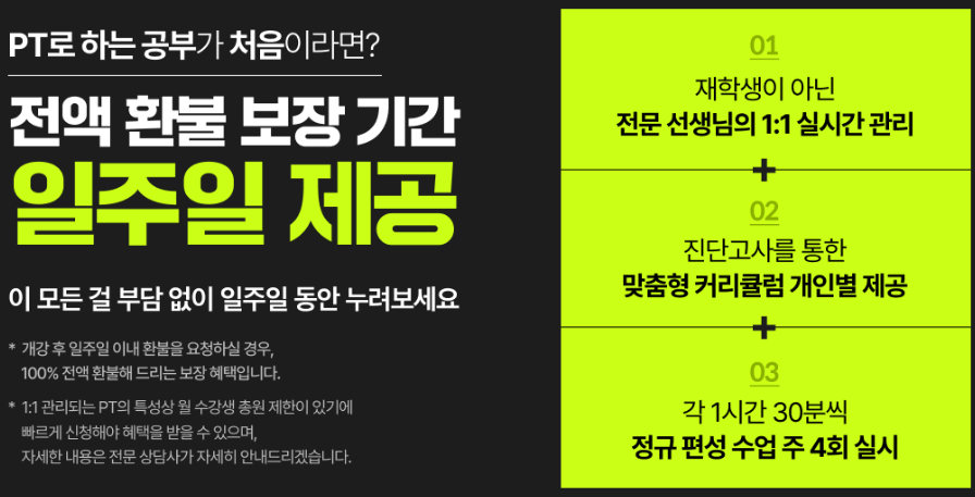 물론 1:1 수업관리를 진행하는 가격이 포함된 것입니다. 중요한건 1주일 동안 수업 후 무료 환불이 가능하다고 하니, 부담없이 해보시는 것도 나쁘지 않다고 생각합니다.
