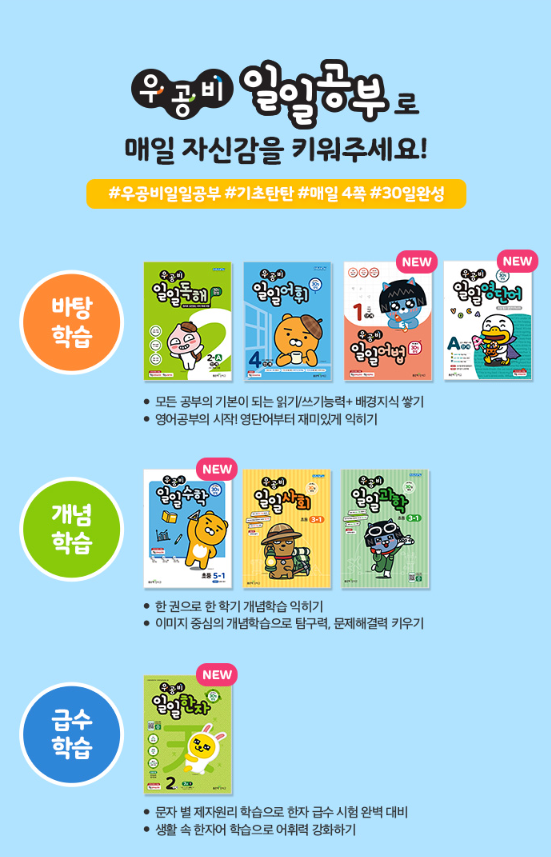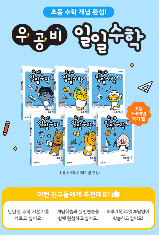 1. 각 단원 시작에 만화로 내용 설명이 되어있어서.. 아이가 재미있어 합니다. 하루하루 할수있는 양이 적당해서 지루해하지 않네요~