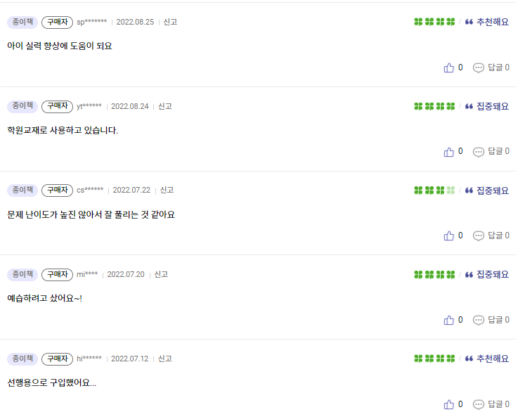 종이책구매자yt******|2022.08.24|신고/집중돼요학원교재로 사용하고 있습니다.0답글 0종이책구매자cs******|2022.07.22|신고/집중돼요문제 난이도가 높진 않아서 잘 풀리는 것 같아요0답글 0종이책구매자mi****|2022.07.20|신고/집중돼요예습하려고 샀어요~!0답글 0종이책구매자hi******|2022.07.12|신고/추천해요선행용으로 구입했어요...