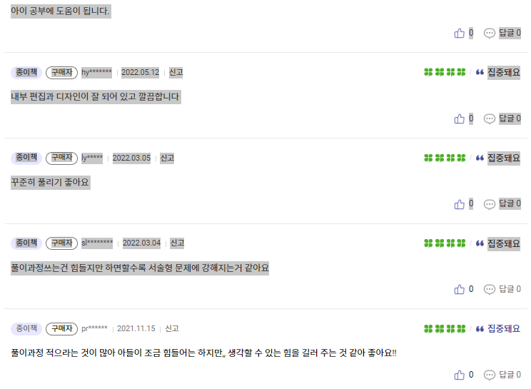 학원교재로 사용하고 있습니다.0답글 0종이책구매자mc*******|2022.05.22|신고/추천해요아이 공부에 도움이 됩니다.0답글 0종이책구매자hy*******|2022.05.12|신고/집중돼요내부 편집과 디자인이 잘 되어 있고 깔끔합니다0답글 0종이책구매자ly*****|2022.03.05|신고/집중돼요꾸준히 풀리기 좋아요0답글 0종이책구매자sl********|2022.03.04|신고/집중돼요풀이과정쓰는건 힘들지만 하면할수록 서술형 문제에 강해지는거 같아요